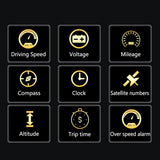 6. Possibilità di visualizzare una vasta gamma di statistiche dell'auto tra cui: velocità di guida, tensione della batteria, chilometraggio, bussola, orologio, altitudine, tempo di viaggio, numero di satellite, allarme di velocità eccessiva ...